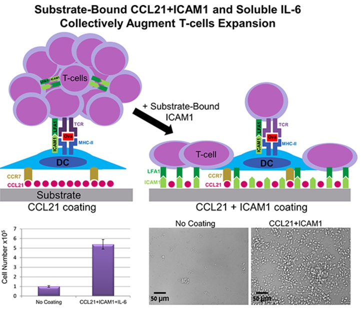 Efficient generation of large quantities of functional T cells is a major bottleneck in the development of T cell-based immunotherapies. Conventional ex-vivo culturing methods often lead to cell death or functional loss. This technology introduces a synthetic immune niche by coating culture surfaces with immobilized ICAM1 and CCL21, combined with soluble IL-6, to mimic the natural lymphoid microenvironment. These conditions promote robust T cell proliferation while enhancing cytotoxic function, including granzyme B expression and tumor-killing capacity.