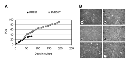 hTERT introduction induces immortalization of prostate stromal cultures. A, proliferation curves of prostate stromal cells infected with hTERT (PM151T) and their noninfected counterparts (PM151). B, morphology of prostate stromal primary and immortalized cultures: a and b, primary cells at passage 5; c and d, hTERT-immortalized cells (PM151T) at passage 37; e and f, hTERT-immortalized cells (PM151T) at passage 103 (b, d, and f are higher magnifications of a, c, and e, respectively).