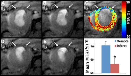 CardioCEST imaging of fibrotic scar tissue 21 days post-MI shows reduced signal and MTR in fibrotic scar regions (white arrows) compared with healthy myocardium (A, B), with persistent signal loss and absent contraction at end-systole (D, E) (*P < 0.05).