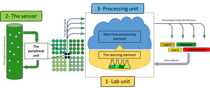 Microalgae hold immense potential as sustainable sources of food, feed, and biofuels. However, growers often face frequent and unpredictable crop collapses caused by biotic and abiotic stresses. Current daily offline monitoring methods are slow and lack sufficient resolution, often failing to provide early warnings.This technology introduces real-time, online bio-optical monitoring that continuously evaluates algal physiological states using in situ optical sensors, enabling early stress detection and effective prevention of crop failure. Importantly, these monitoring devices are low-cost and can be tuned to the specific algae type.