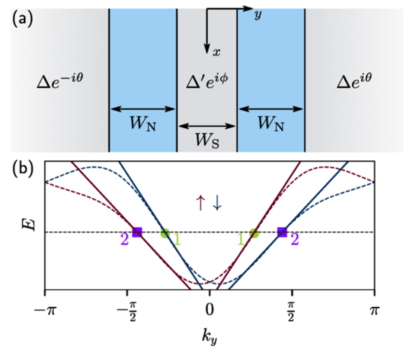 Phase-biased SNSNS junction (gray = superconductors, blue = normal metals). At kx = 0, it reduces to a 1D system where zero-energy crossings indicate topological phase transitions. (b) Transverse spectrum shows four Fermi points with unequal velocities for inner (green) and outer (purple) branches; solid lines show linearized spectra.