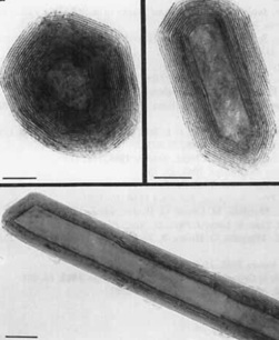 Electron micrographs of polyhedral nanocrystals of WS2