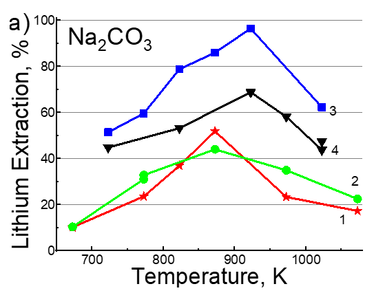 Lithium carbonate extraction yield after ice-water leaching with Me₂CO₃ excess: (1) 10% air, (2) 30% air, (3) 10% CO₂, (4) 30% CO₂.